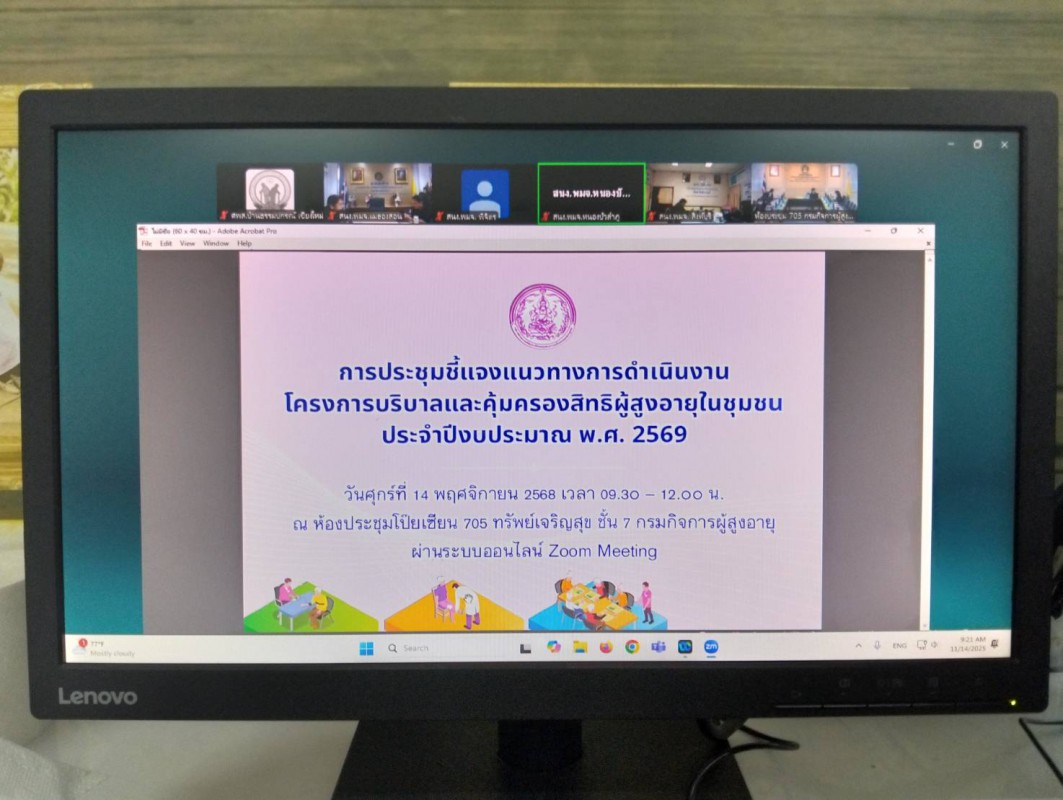 วันที่ 14 พฤศจิกายน 2568 ศูนย์พัฒนาการจัดสวัสดิการสังคมผู้สูงอายุบ้านธรรมปกรณ์(เชียงใหม่)เข้าร่วมประชุมชี้แจงแนวทางการดำเนินงานโครงการบริบาลและคุ้มครองสิทธิผู้สูงอายุในชุมชน ประจำปีงบประมาณ พ.ศ. 2569 ผ่านระบบออนไลน์ Zoom meeting ณ ห้องประชุม ชั้น 2 ศูนย์พัฒนาการจัดสวัสดิการสังคมผู้สูงอายุบ้านธรรมปกรณ์(เชียงใหม่) โดยมี นางวาสนา ทองจันทร์ รองอธิบดีกรมกิจการผู้สูงอายุ เป็นประธานการประชุม