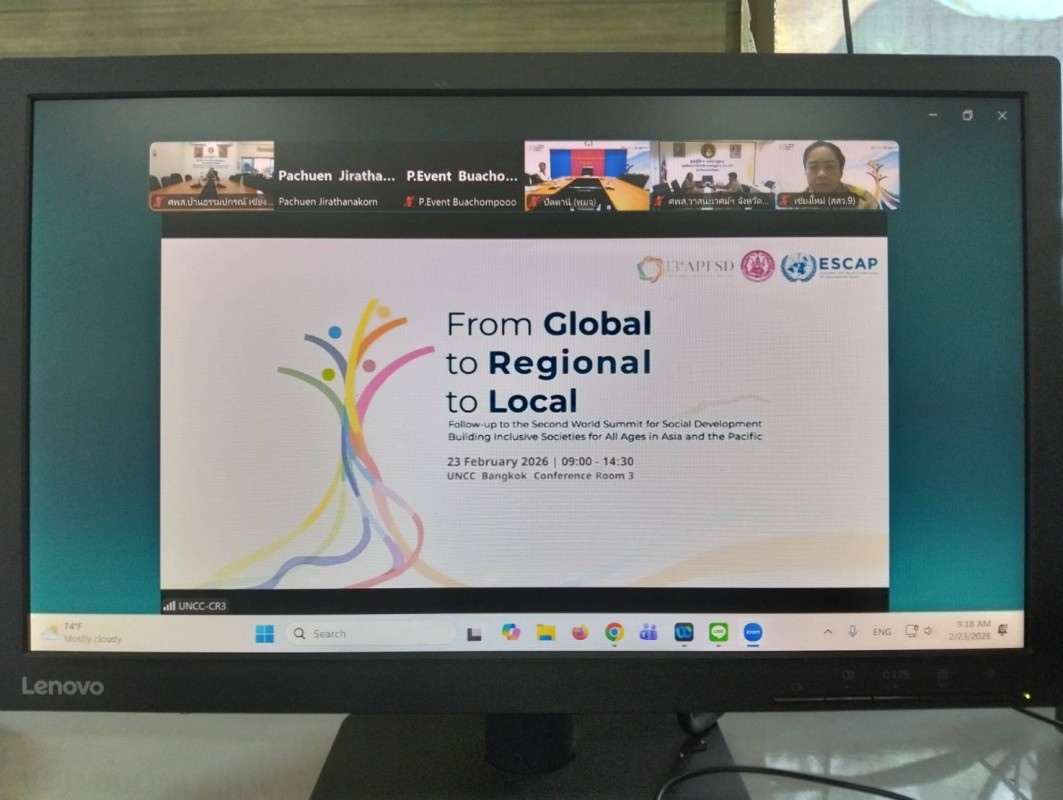 วันที่ 23 กุมภาพันธ์ 2569 ศูนย์พัฒนาการจัดสวัสดิการสังคมผู้สูงอายุบ้านธรรมปกรณ์ (เชียงใหม่)ร่วมรับฟังการประชุม “From Global to Regional to Local : Follow-up to WSSD2” ในหัวข้อ “จากเวทีระดับโลก สู่ภูมิภาค และท้องถิ่น” ผ่านระบบ Zoom Meeting ณ ห้องประชุมชั้น 2 ศูนย์พัฒนาการจัดสวัสดิการสังคมผู้สูงอายุบ้านธรรมปกรณ์ (เชียงใหม่)
