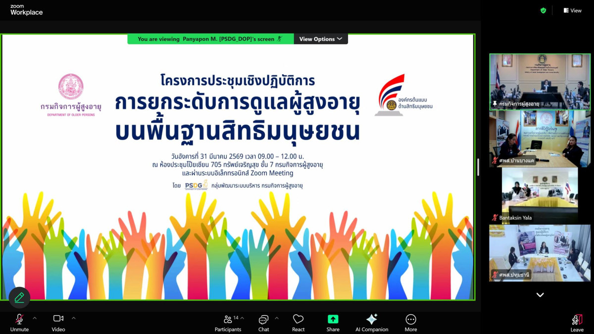 วันที่ 31 มีนาคม 2569 ศูนย์พัฒนาการจัดสวัสดิการสังคมผู้สูงอายุบ้านธรรมปกรณ์(เชียงใหม่) เข้าร่วมประชุมเชิงปฏิบัติการ “ยกระดับการดูแลผู้สูงอายุบนพื้นฐานสิทธิมนุษยชน” มุ่งเปลี่ยนมุมคิดจาก ‘การสงเคราะห์’ สู่ ‘การคุ้มครองสิทธิและศักดิ์ศรีความเป็นมนุษย์’ ผ่านระบบ Zoom meeting โดยมี นายโชคชัย วิเชียรชัยยะ อธิบดีกรมกิจการผู้สูงอายุ เป็นประธานในพิธีเปิดการประชุม