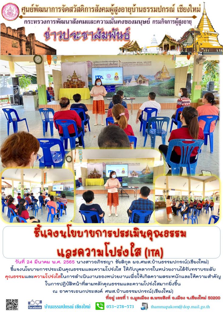 วันที่ 24 มีนาคม พ.ศ. 2565 นางสาวอภิรชญา ชัยติกุล ผอ.ศพส.บ้านธรรมปกรณ์(เชียงใหม่)ชี้แจงนโยบายการประเมินคุณธรรมและความโปร่งใส ให้กับบุคลากรในหน่วยงานได้รับทราบระดับคุณธรรมและความโปร่งใสในการดำเนินงานของหน่วยงานเพื่อให้เกิดความตระหนักและให้ความสำคัญในการปฎิบัติหน้าที่ตามหลักคุณธรรมและความโปร่งใสมากยิ่งขึ้น ณ อาคารเอนกประสงค์ ศพส.บ้านธรรมปกรณ์(เชียงใหม่)