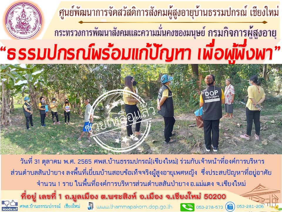 วันที่ 31 ตุลาคม พ.ศ. 2565 ศพส.บ้านธรรมปกรณ์(เชียงใหม่) ร่วมกับเจ้าหน้าที่องค์การบริหาร ส่วนตำบลสันป่ายาง ลงพื้นที่เยี่ยมบ้านสอบข้อเท็จจริงผู้สูงอายุเพศหญิง ซึ่งประสบปัญหาที่อยู่อาศัย จำนวน 1 ราย ในพื้นที่องค์การบริหารส่วนตำบลสันป่ายาง อ.แม่แตง จ.เชียงใหม่
