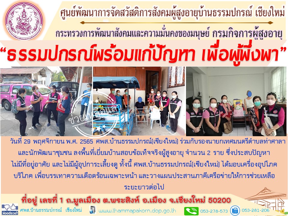 วันที่ 29 พฤศจิกายน พ.ศ. 2565 ศพส.บ้านธรรมปกรณ์(เชียงใหม่) ร่วมกับรองนายกเทศมนตรีตำบลท่าศาลา และนักพัฒนาชุมชน ลงพื้นที่เยี่ยมบ้านสอบข้อเท็จจริงผู้สูงอายุ จำนวน 2 ราย ซึ่งประสบปัญหาไม่มีที่อยู่อาศัย และไม่มีผู้อุปการะเลี้ยงดู ทั้งนี้ ศพส.บ้านธรรมปกรณ์(เชียงใหม่) ได้มอบเครื่องอุปโภคบริโภค เพื่อบรรเทาความเดือดร้อนเฉพาะหน้า และวางแผนประสานภาคีเครือข่ายให้การช่วยเหลือระยะยาวต่อไป