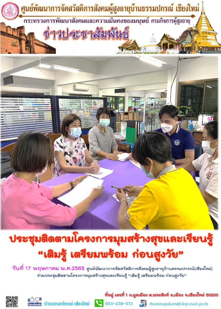 วันที่ 17 พฤษภาคม พ.ศ.2565 ศูนย์พัฒนาการจัดสวัสดิการสังคมผู้สูงอายุบ้านธรรมปกรณ์(เชียงใหม่) ร่วมประชุมติดตามโครงการมุมสร้างสุขและเรียนรู้ “เติมรู้ เตรียมพร้อม ก่อนสูงวัย”
