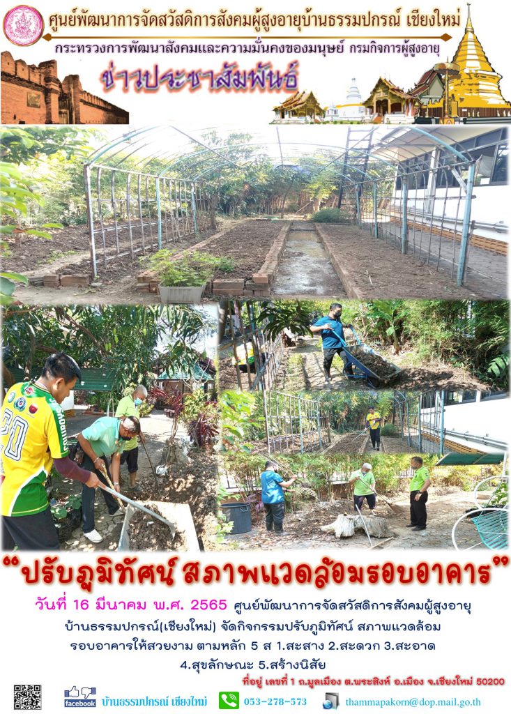 วันที่ 16 มีนาคม พ.ศ. 2565 ศูนย์พัฒนาการจัดสวัสดิการสังคมผู้สูงอายุบ้านธรรมปกรณ์(เชียงใหม่) จัดกิจกรรม ปรับภูมิทัศน์ สภาพแวดล้อมรอบอาคารให้สวยงาม ตามหลัก 5 ส 1.สะสาง 2.สะดวก 3.สะอาด 4.สุขลักษณะ 5.สร้างนิสัย