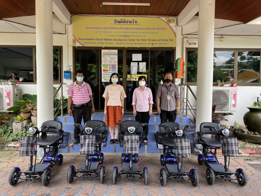 วันอังคารที่ 17 สิงหาคม 2564 นางสาวอภิรชญา ชัยติกุล ผอ.ศพส.บ้านธรรมปกรณ์(เชียงใหม่)พร้อมด้วยข้าราชการ รับมอบครุภัณฑ์ จากสำนักงานพัฒนาวิทยาศาสตร์และเทคโนโลยีแห่งชาติ (สวทช.) ตามโครงการแผนงานบูรณาการเตรียมความพร้อมเพื่อรองรับสูงวัย ประจำปีงบประมาณ 2564 นวัตกรรม กลุ่ม ค อุปกรณ์อำนวยความสะดวกสำหรับผู้สูงอายุ “พาหนะไฟฟ้าขนาดเล็ก ที่พับเป็นกระเป๋าเดินทางได้” จำนวน 5 คัน เพื่อให้ผู้สูงอายุ ในศพส.บ้านธรรมปกรณ์(เชียงใหม่) ได้เข้าถึงนวัตกรรมและเทคโนโลยีในการดูแลและได้รับบริการที่ดียิ่งขึ้น